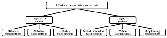 Currently, according to the characteristics of different methods, we divide the calibration between the LiDAR and visible light camera into a target-based method and a target-less method. For details and representative works, refer to Figure 1. The target-based method is to find the 2D feature points in an image coordinate system and the 3D feature points in a LiDAR coordinate system with the help of a standard target to establish geometric constraints and solve the extrinsic parameters of sensors through perspective-n-point (PNP) or nonlinear optimization. According to the shape of calibration target, it can be divided into 1D objects, such as line-feature-based target [8,9,10], 2D objects, such as chessboard [11,12,13] or circular holes [14], and 3D objects [15,16], such as spherical targets [17]. Refs. [18,19] detected the corner points in images and point clouds by the intersection of edge fitting lines, respectively, and solved calibration parameters by a linear equation. The calibration target they used was a monochrome board. This is mainly due to the fact that two different colors have different effects on LiDAR ranging, which will affect the accuracy of plane fitting. Refs. [20,21,22] introduced nonlinear optimization to improve the calibration accuracy. Ref. [23] adopted the method of space joint calibration combining coarse measurement and fine adjustment. The innovation of [24] was to use a known plane to estimate the 3D corners. Refs. [24,25] used a LiDARTag and intensity information to locate target, which was similar to the method in [26].
