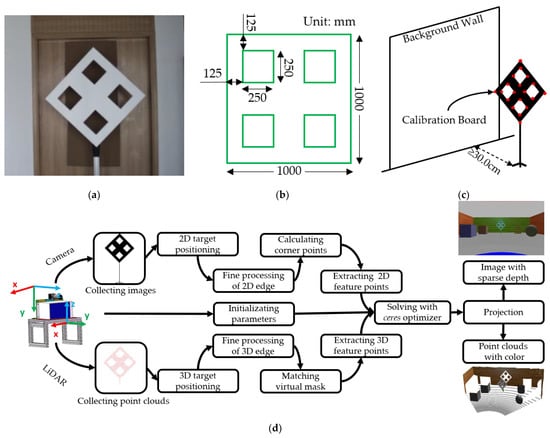 Figure 2a,b show the design of the calibration board. We need to place the calibration board about 30.0 cm in front of a flat wall to better obtain the points of the background wall for edge refinement, as shown in Figure 2c. In Section 3.1, we will use Euclidean distance to cluster all objects. In order to prevent the calibration board and the flat wall from being clustered into a category, the calibration board needs to keep a certain distance from the wall, e.g., 30.0 cm is considered in this paper. Actually, other suitable distances can also be used in practical applications. Holes dug in the calibration board are convenient for us to use geometric information for locating. Figure 2d is a diagrammatic sketch of this method, which involves the locating and matching of 3D feature points, the locating and refinement of 2D feature points, the solution of optimization equations, and the 3D–2D projection results. If we unify the data to the LiDAR coordinate system, we can get the point clouds with color, or unify the data to the camera coordinate system, and we can also get an image with sparse depth information. The symbols and function we will use in the following sections are given in Table 1.