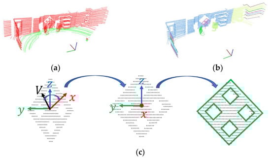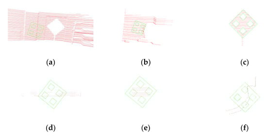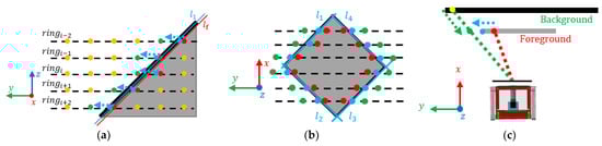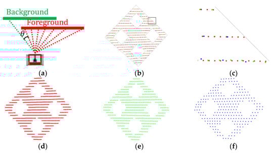 As shown in the Figure 5a, for the partial schematic diagram of the calibration board scanned by LiDAR, we use as an example, where the green background edge point is , the red foreground edge point on the board is , the direction vector (blue dotted line) between these two points is , where . The set of background edge points is ; the set of edge points of the foreground calibration object is .