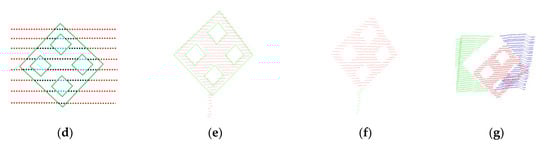 Let us take Score as the evaluation function to screen . Three parts of can filter out the objects with a large or small number of points to ensure that the cluster where the calibration board is located can be filtered out with a high score. Figure 3e is the one with the highest Score among many point clouds. In Section 4.2, we will analyze the impact of ScoreA, ScoreB, and ScoreC on the automatic locating calibration board. It can be found that the connecting rod of the calibration board is also selected, shown in Figure 3e. The results of Figure 3c,d are ideal. In fact, due to the Euclidean clustering, the connecting rod of the calibration board will also be clustered into one category. We need to discard it for it should not participate in the calculation. Finally, we can delete the ring with a small number of point clouds by traversing each ring, as shown in the Figure 3f. The obtained red point cloud is . We select a 1.0 m × 1.0 m × 1.0 m box in the center of to ensure that the (blue point clouds and green point clouds in Figure 3g) is framed together. Therefore, the calibration board is required to be placed within 1.0 m in front of the background wall. So far, we have acquired and through automatic locating, and we can further refine the edge points by the method described in next section.