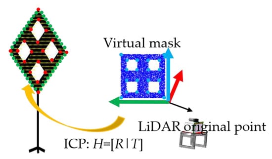 This section introduces a scheme for obtaining 3D feature points of the calibration board by using virtual mask matching. The edge point clouds,and , are combined into a new point clouds ∪ We generate a virtual mask with () random points in YOZ plane with the same size as our board, shown in Figure 6, set () = 104. We use the iterative closest point (ICP) method to match the with the , and the matching result is a rigid transformation matrix. The feature points we need can be calculated by , where are feature points set on the .