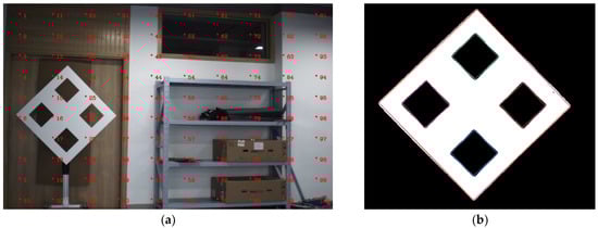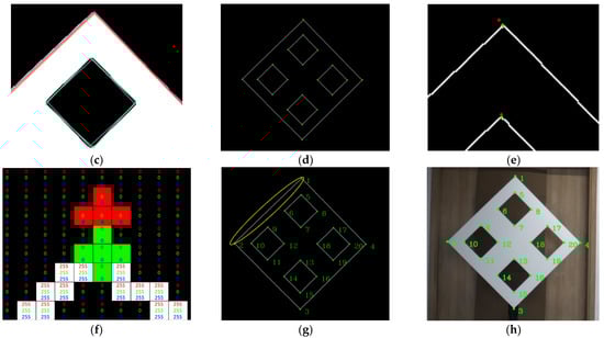 After obtaining the corner points of roughly locating, it can be clearly found that the locating position is not accurate (red points in Figure 7d–f). This is because the rectangle detection has poor robustness and accuracy. It is necessary to further refine the corner points. Taking and , the green points in Figure 7g as an example, we connect and to obtain a straight line , count all the points close to , which are circled by a yellow ellipse in Figure 7g. We use these points to refit the line and get the refined. We solve the connecting lines between the other points in the same way and estimate the refined corner points by the intersection of straight lines. As described in the green dots, it can be found that the green points after the fine processing are more accurate than the red points detected before. In Figure 7g, for convenience of representation, we visualize the result in pixels. However, in fact, the coordinates of these corner points are sub-pixel. Finally, according to the order of feature points in Figure 7h, each refined corner point is sorted to facilitate pairing with 3D feature points.