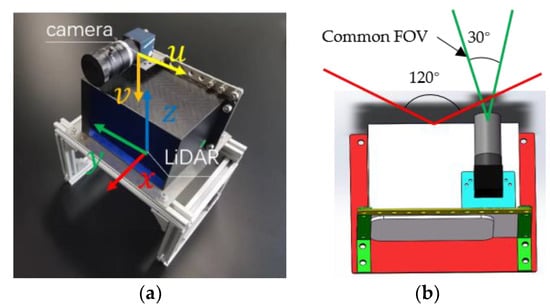 Setup of proposed method. (a) is the coordinate system definition, and (b) is the common FOV of two sensors.