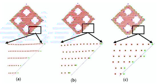 Refined edge point visualization results. Red points are the points scanned by LiDAR; green points are refined edge points. The blue lines are the boundary lines as large as the calibration object. (a) is the display of refined points when θ = 0.1°, (b) is the result when θ = 0.2°, and (c) is the result when θ = 0.4°.
