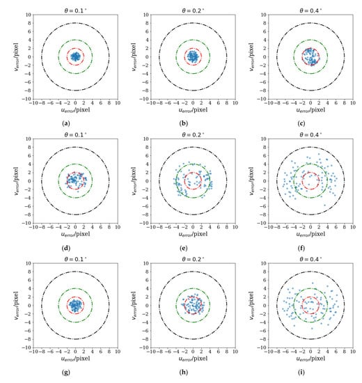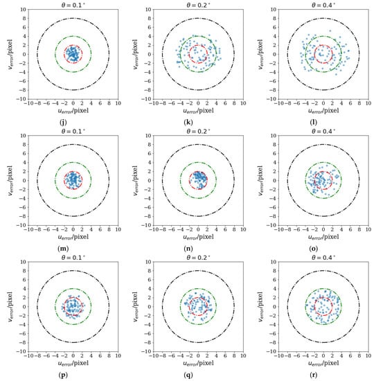 Error circle of different methods, the are projection errors in the horizontal and vertical directions, respectively. (a–c) are proposed methods, respectively, corresponding to θ = 0.1, 0.2, and 0.4; we select one frame data for each position, (d–f) are methods in [18], respectively, corresponding to θ = 0.1, 0.2, and 0.4; (g–i) are the methods in [22], respectively, corresponding to θ = 0.1, 0.2, and 0.4, (j–l) are the methods in [19], respectively, corresponding to θ = 0.1, 0.2, and 0.4, (m–o) are the methods in [20], respectively, corresponding to θ = 0.1, 0.2, and 0.4, and (p–r) are the methods in [24], respectively, corresponding to θ = 0.1, 0.2, and 0.4.