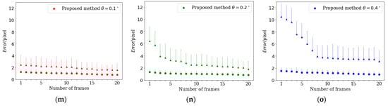 Figure 12a–o analyze the re-projection results under different numbers of frames. It is obvious that other methods need at least 3–5 frames of data to converge, and with the increase of θ, the error of final convergence will also increase. The proposed method has a low re-projection error in the first frame, and with the increase of the number of frames, the error change is not significant. By increasing the position of the calibration board, more data can be obtained. We use 2–10 positions to carry out the calibration experiment, shown in Table 5. It can be clearly found that with the increase of data volume, the average value and variance of re-projection error are reduced, which also shows the robustness of the proposed method. Our calibration board can add 20 more pairs of feature points without adding a position, which is larger than the data volume of other methods, and the results are more convincing.
