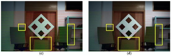 Results of outdoor scene test, θ = 0.1°. The contents in yellow rectangles in (a–d) are projections at different distances.