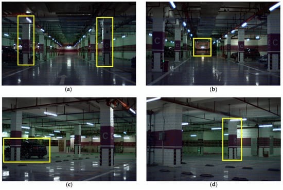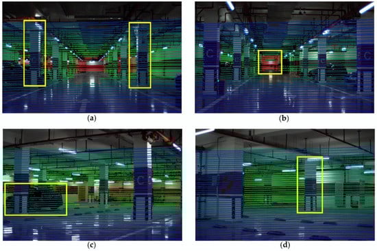 Results of outdoor scene test, θ = 0.2°. The contents in yellow rectangles in (a–d) are projections at different distances.