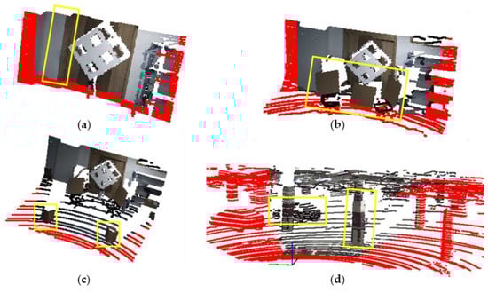 Results of 3D reconstruction effect. The test distances of (a–c) are 3.0 m, 5.0 m, and 7.0 m, respectively, (d) is the test result of outdoor scene. The red point is the point in the non-common FOV of the LiDAR and camera. The contents in yellow rectangles can provide detailed reference.