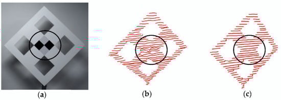 As for the selection of , we use the actual size of the calibration board (Figure 2b) for reference. Taking 0.1 as the initial value. The newly expanded edge points are used to fit a rectangle by random sample consensus (RANSAC). The termination condition of RANSAC fitting is the difference between the calculated rectangle size and the actual physical size. If this difference is less than the th, the outward expansion can be stopped, and the edge of the current outward expansion should be saved. If the difference is larger than th, it indicates that there is still a gap between the measured result and the actual size, and it needs to be further expanded. That is, scale needs to continue to increase with a step size (ss):