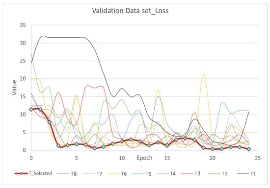 Line chart of the loss and F1 score in the validation dataset for different subsets (red line with yellow diamond dots indicates the selected subset). T: tested subset used for selecting optimum training area.