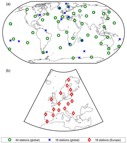 Location of the GNSS ground stations used in the simulations, shown on the two maps for better readability: (a) 44 and 16 stations placed globally, and (b) 16 stations in Europe.