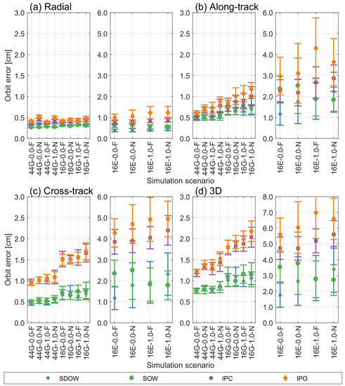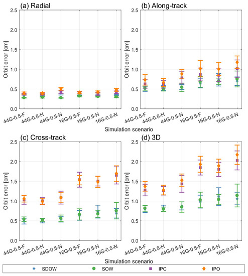 The results of the orbit determination are presented in Figure 3. The values of weighting coefficients might not have a substantial impact on errors of estimated parameters. The radial component in Figure 3a is the least sensitive on choice of different simulation settings as the results are very similar for all simulation scenarios (range of RMS is from 0.3 cm to 0.6 cm). The impact of various simulation settings is more visible in errors for the along-track and cross-track components. While considering the impact of VCE approach, usually the Helmert method is best, followed by Förstner and Nominal, but the differences between them are very small, i.e., less than 0.2 cm for sequential schemes and up to 0.4 cm for intra-plane schemes. The choice of connectivity scheme can determine the method performance, i.e., results for sequential schemes are more homogenous with the Helmert approach across different scenarios than for intra-plane schemes. For sequential schemes, the choice of VCE approach is not important when 44 ground stations are used (Figure 3d). For the combination of 16 stations and intra-plane schemes, there are modest differences between weighting methods, in favor of the Helmert. For sequential dual one-way scheme, the Förstner approach would be the best choice of VCE method as the orbit errors with 16 stations located globally are slightly lower than for the Helmert approach. For most scenarios, using the Helmert approach gives no more than about 20% improvement in orbit accuracy compared with the Förstner approach, especially when the ISL connectivity scheme is not dynamic (e.g., in intra-plane schemes). Improvement is more noticeable for Förstner or Helmert in relation to Nominal weighting. The difference between extreme values of RMS orbit errors obtained from repeated simulations can reach 20–30% of mean values. It is also worth mentioning that in tested cases the Helmert and Förstner approaches are sensitive to the number of GNSS observations. When 16 stations were used, the standard deviations of solutions are larger than with use of 44 ground stations, but still smaller than for Nominal weighting in respective settings.