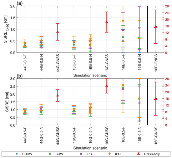 (a) SISRE(orb) and (b) SISRE values computed under different simulation scenarios. Please note that values for 16E-GNSS are presented with different vertical axis in cm.