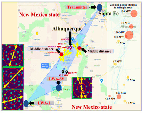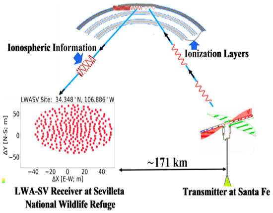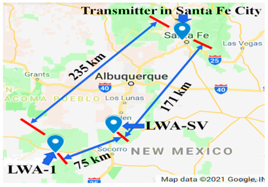The distance between the Santa Fe transmitter and WA-SV is about 171 km, whereas the LWA-1 station is about 235 km away from the transmitter. The separation between the two stations—LWA1 and LWA-SV—is around 75 km, as shown in Figure 4 [30].