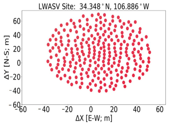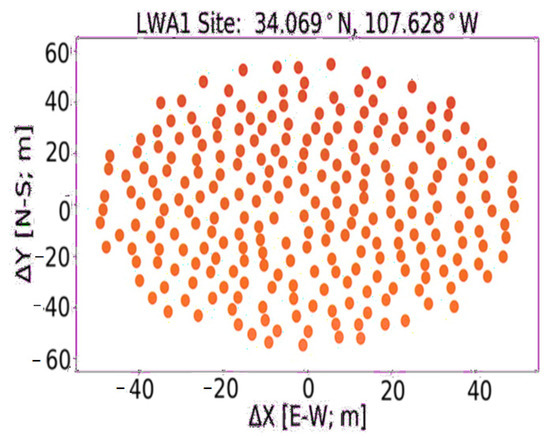 Datasets were captured at the Long Wavelength Array (LWA)-SV station at the Sevilleta National Wildlife Refuge 34.35°N, 106.89°W [28] LWA-1 station. The LWA-SV and LWA-1 (University Radio Observatory) in central New Mexico captured radio wave frequencies from 3 MHz to 88 MHz, and each array consisted of 256 pairs of dipole-type antennas, while each pair of antennas had orthogonal polarizations on one stand. Antennas of the LWA-SV were arranged in a 110 m by 100 m north–south area distributed in about 100 m of aperture, as seen in Figure 2 [29]. Array geometry of the LWA-1 was within a 100 m (east–west) × 110 m (north–south) elliptical shape, as illustrated in Figure 3 [30]. It was designed to produce high-sensitivity, high-resolution images operating over a wide range of frequencies [31]. Both radio telescope arrays had a minimum of 5 m of separation between the antennas, which allowed for easy access of elements for maintenance purposes and also decreased beam desensitization because of sky noise correlation [32]. They received a carrier wave after reflection off the ionosphere from a transmitter placed in Santa Fe and transmitted radio waves with frequencies between 3 and 7 MHz. However, only one dataset (5.357 MHz) was analyzed as it had an obvious carrier wave. Transmitter and receiver locations, sent signal, and data specifications utilized during the LWA-SV and LWA-1 experiments are illustrated in Table 1 and Table 2 below.