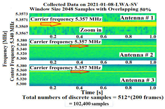 The LWA Software Library (LSL) was created to manage the specific data formats produced by LWA-1 and LWA-SV and to make them available for basic analysis tools [33]. A total of about 28 min of each data (LWA-1 and LWA-SV) using a sampling frequency of 100 kHz was obtained by digitally acquiring more than three giga-samples in total. After the initial analysis step, data were found to be consistent throughout the recording time after pre-conditioning (channel selection, noise reduction, etc.). The calculated wavevector (LWA-SV) remained pointed in a north–south direction around 90% of the time, which was in agreement with the physical locations of the transmitter and the receiver array. However, the wavevector for the LWA-1 signals pointed northeast–southwest between 30 to 65 degrees 70% of the time, which showed the effects of the ionospheric disturbances that occurred during the recording time.