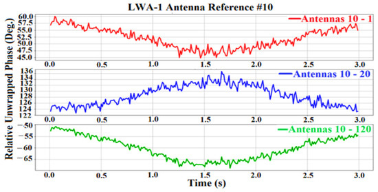The plot displays an example of the relative unwrapped phases versus time in 3 s for LWA−1.