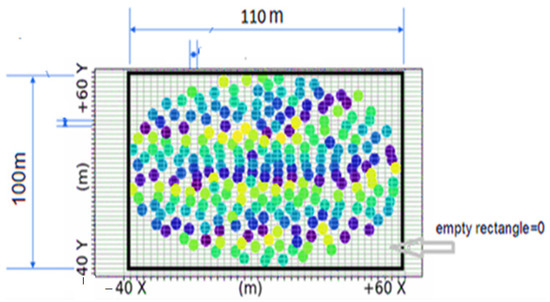 The area of antenna locations in the x-direction and y-direction represents phase image using a relative unwrapped phase, as shown in Figure 8. The color of the phase image represents the size of the phase shift using unwrapped angles. The positive side illustrates the top of the wave, whereas the negative side shows the bottom side of the wave. The height of a wave represents the amplitude that could be positive or negative. The imaging processing of the relative unwrapped phase was done using a mesh used on the antenna positions and divided into several rectangular shapes. The area (dx × dy) of each cell was around 6 m2, as depicted in Figure 9. Each stand had only one relative unwrapped phase, and the pixels outside the image were to zero. Parameters were the center frequency 5.334999 MHz and carrier bin 5.351500 MHz with a sample rate of 100 kHz. The relative unwrapped phases were calculated by taking the stand number 134 of LWA-SV and 10 of LWA-1 as a reference, which were located close to the center of the antenna locations. Polarization zero was chosen as cross-polarizations were provided in the dataset.