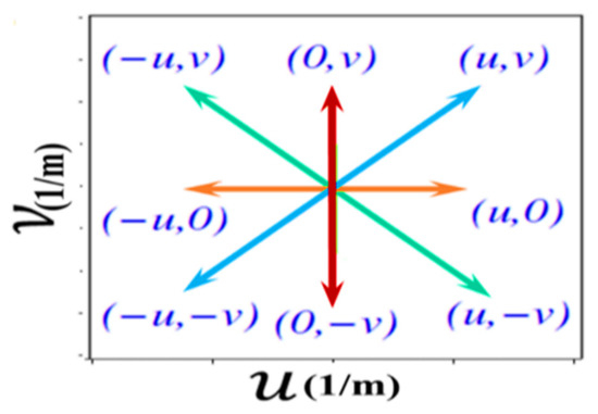 and where and are the amplitude and phase distributions of the spatial spectrum given by . A 2D Fourier image depicted this symmetry criterion graphically as a succession of symmetric points in the u and v plane, as shown in Figure 10.
