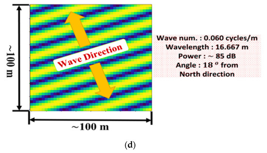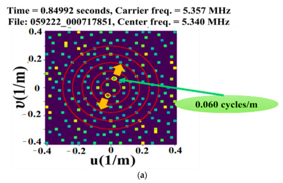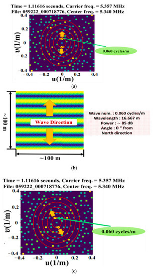 The 2D Fourier image showed many frequency peaks or approximately 170 peaks, as shown in Figure 11a,c. Each peak represented a set of waves on the ionosphere with its own amplitude, frequency, and wave vector. One pair of peaks located close to the origin had a frequency of 0.06 cycles/m and a wavelength of 16.667 m, which was the largest peak and was studied the most for its possible location of creation. It had a wave vector that sometimes pointed north–south and sometimes slightly tilted from this direction, as shown in Figure 11. Different time sequences were tested to check the direction of the wavevectors. As a result, the wavevector maintained pointing around 90% of time in a north-south direction, and 10% of time was tilted in a westward direction.