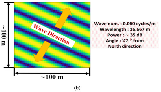 (a) A Fourier image demonstrating the wave direction (0.06 cycles/m) of LWA-1 with angles about 60 degrees eastward (northeast–southwest) from the north–south direction as well as its IFT in (b).