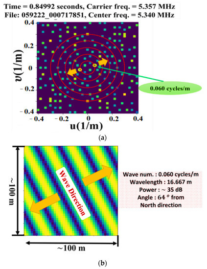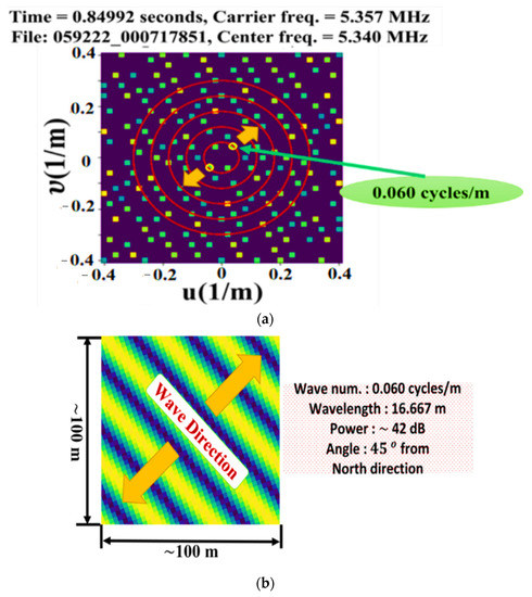 (a) A Fourier image of LWA-1 data with 0.06 cycles/m displaying a northeast–southwest wave vector direction of ~45 degrees eastward from the north–south direction. (b) Its IFT reveals the set of waves and its wave vector.