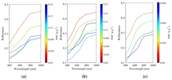 3.3. Soil Hyperspectral Reflectance at Different SMC Levels