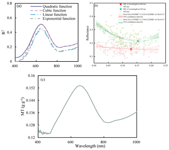 - The relationship of spectral reflectance and SMC can be fitted with a quadratic function, and the MT value of each waveband can be determined at the minimum point of the corresponding quadratic function.