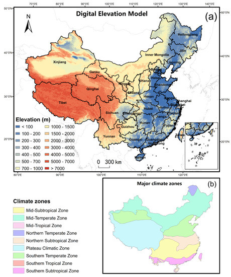 Digital elevation model (a) and climate zones of China (b) with annotation of the provinces.