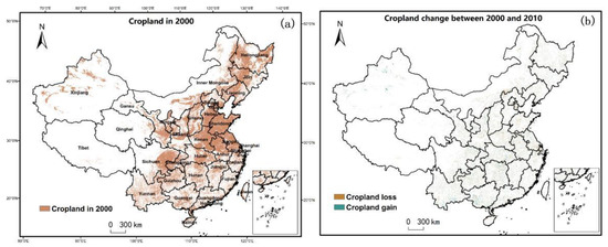 Spatial pattern of cropland in GlobeLand30 ((a): 2000, (b): 2000–2010). Note that the overall accuracy of GlobeLand30 in China has reached 80%, including the cropland layer. The maps were generated using ArcGIS 10.2 ESRI (Environmental Systems Research Institute, 2013).