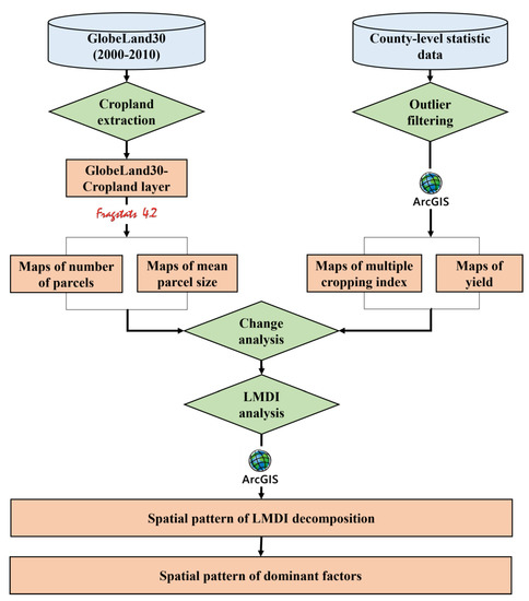 In the literature, crop production across China has typically not been studied in a simultaneously comprehensive and systematic way due to complicated agricultural settings. First, a thorough understanding of the spatial-temporal dynamics of crop production is hampered by the fact that most studies so far have focused on individual factors in isolation, such as drip irrigation [11], consumption of agricultural chemicals [12,13], policy regimes [13,14], or have just analyzed crop production as a whole in which individual factors are lumped together [15]. Second, in these studies the influencing factors of crop production are hierarchical, for example, multiple cropping index, yield, mean parcel size, and number of parcels have direct impacts on crop production, whereas the above factors (e.g., drip irrigation) have an indirect impact on crop production by affecting the four directly influencing factors (i.e., multiple cropping index, yield, mean parcel size, and number of parcels). Hence, by assigning all types of components at the same influencing level, and therefore neglecting the interaction of influencing factors among the different levels, it is not possible to identify the true drivers behind crop production [16]. Third, until now the Logarithmic-Mean-Divisia-Index (LMDI) has mainly been studied at the national and provincial scale [17,18,19,20], which is not detailed enough to reveal the underlying driving factors often operating at a smaller spatial scale. In fact, counties are the fundamental units of crop production in China, because the drivers within a given province may vary significantly at the county level [21]. Hence, obtaining an understanding of the spatio-temporal variability in crop production and its associated drivers at the county scale is crucial for the development of regional policies to combat food security issues and to address the associated United Nations Sustainable Development Goals (SDGs). Fourth, the lack of studies that cover the entire nation makes it difficult to make interregional comparisons. As a solution to these critical shortcomings, we introduce a framework that decomposes crop production into factors, which can all be quantified.