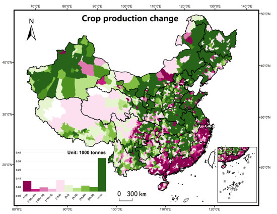 Since the 2000s, when China began to reinforce rural economic reform, crop production has been characterized by remarkable growth. This is reflected in the general increasing trend in crop production across the nation, as shown in Figure 5. Over the period 2000–2010, China’s total crop production has increased by 30%. As our results indicate, more than 60% of the counties experienced an increase in crop production, which were mainly located in the northeast of China as well as across the North China Plain, also called “the breadbasket of China”. A total of 70% of the area of these regions is characterized by flat topography (e.g., extensive plateaus or valleys), and therefore these are the predominate crop production areas making a significant contribution to national overall crop production growth. However, 29% of the counties across China were characterized by a loss in crop production, which were mainly located in southeast coastal regions, scattered across the Guangdong, Fujian, Zhejiang, and Guangxi provinces.