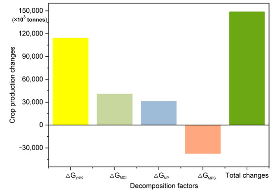 In the present study, the factor decomposition breaks the nationwide increase in crop production down into four contributing factors (i.e., yield, MCI, NP, and NPS). Figure 6 shows that the overall crop production increase in China has mainly been driven by three factors, i.e., MCI, yield, and NP, of which yield had the most important influence. More specifically, yield had a relative contribution of 77% to the total crop production change, whereas MCI and NP contributed only +27% and −21%, respectively. In contrast, MPS had a somewhat negative impact on crop production change, accounting for −25%.