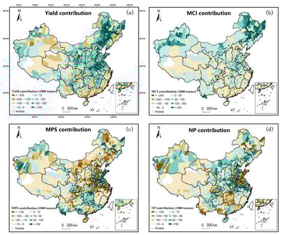 Decomposition of changes in China’s crop production at the county scale with the individual contributions of the factors being given in the subpanels, (a): Yield, (b): Multiple Cropping Index (MCI), (c): Mean Parcel Size (MPS), (d): Number of Parcels (NP).