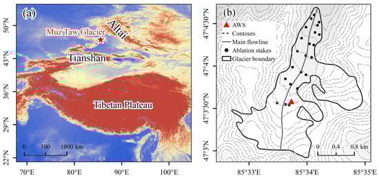 (a) Location map of the study area with the red five-pointed star representing the Muz Taw Glacier in the Sawir Mountains, Central Asia. (b) Topography of the Muz Taw Glacier, with the distribution of ablation stakes and the AWS.