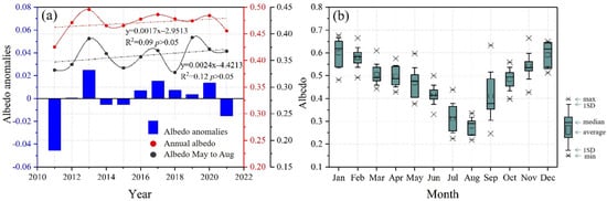 As shown in Figure 2a, there were mostly positive anomalies from 2011 to 2021, and the magnitude of negative anomalies was weakened, indicating an increasing trend for annual average albedo, with an annual average albedo increase of approximately 0.17%. The average albedo also showed an increasing trend from May to August, with an annual average albedo increase of approximately 0.24%. The glacier surface albedo in 2012 was almost equal to the average albedo.