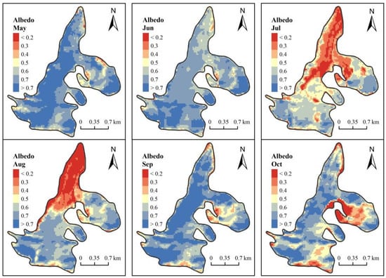 Figure 3 shows glacier surface albedo variations during the melt season from May to October. The average glacier surface albedo was 0.66 in May. The surface albedo was higher than 0.6 for approximately 78% of the glacier areas, and the proportion of glacier area accounted for 47% when the albedo was higher than 0.7. The average surface albedo was 0.63 in June, with most values (49%) ranging between 0.6 and 0.7. The average surface albedo was 0.43 in July. The proportion of areas with albedo less than 0.4 was 39%, with 43% of values ranging from 0.4 to 0.6, and only 18% of the areas higher than 0.6. The average albedo in August was 0.47, with 50% of the glacier surface albedo between 0.5 and 0.7. The average albedo was 0.65 in September and 0.56 in October, and most values (70%) were greater than 0.6 and most areas (69%) were greater than 0.5, with the largest number of pixels between 0.6 and 0.7 (30%), respectively. Overall, the glacier surface albedo would continue to decline throughout the melt season and eventually reach its minimum. Although the albedo continued to decline between May and June, the value remained above 0.6, and then the glacier surface albedo showed an accelerated decline in July, and stabilized at the minimum ordinarily between July and August, when the value remained below 0.5. The surface albedo increased again with the snowfall and fresh snow accumulation from late August or the beginning of September. These phenomena were also found on Urumqi Glacier No.1 in TianShan [].