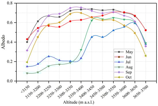 The spatial variation in the surface albedo on a single glacier was primarily affected by topographic factors. The albedo along the glacier main flowline can be used as an indicator to describe the spatial distribution of the glacier surface albedo. Thus, we investigated the albedo variations along the glacier main flowline at 50 m altitude intervals from May to October (Figure 4). The results displayed that the glacier surface albedo generally increased with rising altitude, and an upward, obvious, steep gradient occurred especially at the altitude range of 3350–3550 m a.s.l. along the glacier main flowline. However, the glacier surface albedo above 3600 m a.s.l. decreased obviously with rising altitude. The increase in the surface albedo was due to the weakening of the glacier melt, the reduction of the bare ice area, and the expansion of the fresh snow or firn area with rising altitude. The decrease in the surface albedo was probably due to the increase of the bare rock at the top of the glacier. Furthermore, the largely undulating terrain above 3600 m a.s.l. made it difficult to retain snow. The change of the solar incident angle caused by the slope and aspect was probably another reason for the obvious decrease of albedo in this altitude zone. It was obvious that the variation in the surface albedo with the altitude was more significant from July and August, further confirming that Landsat images at the end of the melt season should be given priority in extracting the glacier SLA, which will be discussed in detail in Section 4.3.