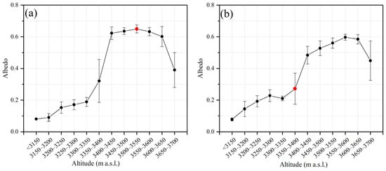 The glacier SLA at the end of the melt season should generally be the highest SLA for a given year, meaning that it can be used to characterize the inter-annual variation trend of glacier SLA. As described above, the surface albedo generally increased along with the rising altitude. There are two trends in determining the albedo threshold. The first trend in surface albedo variation along with rising altitude is shown in Figure 5a, with two obvious inflection points. The first inflection point is located at an altitude of 3350–3400 m a.s.l. Because of the largest standard deviation of albedo at this altitude zone, the changes in the properties of cover objects on the glacier surface are most drastic in this altitude zone, which is defined as the boundary between the bare-ice area and the ice/snow transition area. The second inflection point is located at an altitude of 3500–3550 m a.s.l., as the surface albedo began to decline, which is defined as the boundary between the ice/snow transition zone and the snow cover zone. The boundary between the ice/snow transition zone and the snow cover zone is also called the snowline, according to [].
