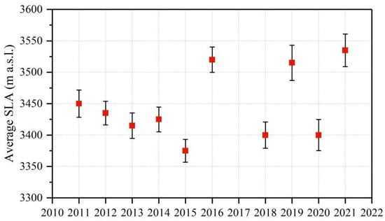 The second trend in surface albedo variation along with altitude rising is shown in Figure 5b. There is an obvious inflection point of the albedo, located at an altitude zone of 3350–3400 m a.s.l., because of the largest standard deviation. It is regarded as the boundary between the bare ice and the snow cover area. The albedo thresholds for other periods are determined based on the same principle. As shown in Figure 6, the SLA of the Muz Taw Glacier from 2011 to 2021 was finally obtained. The SLA of the glacier at the end of melt seasons from Landsat images was investigated, ranging from 3375 m a.s.l. in 2015 to 3535 m a.s.l. in 2021, with an average SLA of 3446 m a.s.l. and a variation of 160 m. A trend of continued melting was manifested on the Muz Taw Glacier during 2011–2021, with an increased rate of approximately 6.9 m∙a−1. However, the SLA in 2017 was not obtained because the Landsat image was completely blocked by temporary snowfalls or cloud cover in later summer.