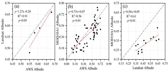 In the current study, although there were fewer verification points for albedo derived from Landsat images, more AWS data were used to validate the accuracy of the MOD10A1. A significant agreement was observed between the albedo from MOD10A1 products and the in situ-measured albedo. Thus, the method recommended by Liang et al. [] was adopted to further validate the accuracy of the surface albedo derived from Landsat images. The albedo derived from Landsat images were up-scaled and aggregated into a spatial resolution range of 500 m. The MOD10A1 albedo products were up-scaled and aggregated into a temporal resolution range of 15 d. As proposed by Gunnarsson et al. [], “the temporal aggregation range was set as the number of days backwards and forwards at each center date (t = 0) to merge to a single stack for further processing”. We selected a temporal aggregation range of 7 d backward and forward (t = ±7 d); in total, 15 d can contribute data to each center date albedo. In this way, the spatio-temporal resolution of the Landsat and MOD10A1 images were consistent in order to further validate the accuracy of the surface albedo. The correlation coefficient was 0.78 at the 99% confidence level between the two remote sensing products, i.e., Landsat and MOD10A1 (Figure 7c).