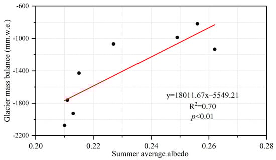 The glacier surface albedo is closely related to its mass balance because the albedo controls the energy budget process between the glacier surface and the atmosphere [,]. In this study, we investigated the relationships between the summer (from June to August) average surface albedo values retrieved from the MOD10A1 and the annual glacier mass balance measured during 2017–2020. The mass balance used to establish the relationship here was obtained by partition statistics at an altitude of 3100–3400 m a.s.l. according to an altitude interval of 100 m. The average albedo was 0.23 in summer, and the annual mass balance was −1399 mm w.e. during 2017–2020. A significant correlation (R = −0.84) was observed at the 99% confidence level between the average annual glacier mass balance and the average surface albedo in summer, indicating that the glacier mass loss or accumulated corresponds to the decrease or increase in surface albedo (Figure 8). The linear relationship between the albedo and mass balance indicated that the 0.005 decrease in albedo led to glacier mass loss enhanced by 100 mm w.e. on the Muz Taw Glacier. It has been confirmed in previous studies [,] that the decrease in the albedo accelerated the glacier melt. It had been found that the summer average albedo also showed a significant relationship with the annual average mass balance for glaciers in different mountains, based on the existing observation data and previous studies. For instance, the 0.006 decrease in the albedo of the Urumqi Glacier No.1 in the Tianshan Mountains possibly caused glacier mass loss by 100 mm w.e. during 2001–2018 [,]. For the Laohugou glacier No.12 in the Qilian Mountains, the decrease in the surface albedo by 0.03 corresponding with the glacier melt was enhanced by 100 mm w.e. during 2001–2018 []. For the Xiaodongkemadi Glacier in the Tanggula Mountains, Central Tibetan Plateau, the albedo decreasing by 0.02 possibly caused glacier mass loss of 100 mm w.e. during 2001–2010 [,]. Although the contribution of the glacier surface albedo to the mass balance existed in different mountains distinctly, the variation of the surface albedo mentioned above cannot be neglected in the estimation of glacier melt.