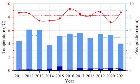 Variations in the average air temperature and the precipitation from June to September. The red dots represent the air temperature, the light blue bars represent the total amount of precipitation, the dark blue bars represent the amount of solid precipitation, and the dotted line represents the linear trend.