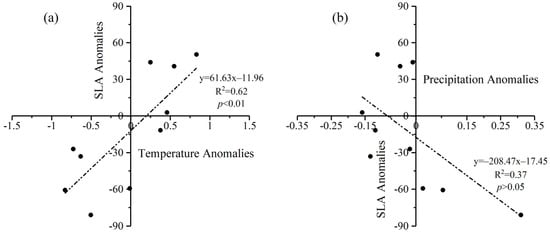The intense ablation and accumulation of the Muz Taw Glacier usually occur simultaneously from June to September. Figure 9 shows the changes in air temperature and precipitation from June to September over the 2011–2021 period. During the study period, the air temperature increased slightly at a rate of 0.008 °C·a−1, with an average air temperature of 8 °C. The total precipitation showed a downward trend, and no significant trend was observed in solid precipitation. The SLA was extremely sensitive to changes in air temperature and precipitation variables. In this study, the sensitivity of the SLA to climate variables was evaluated by establishing a linear regression between SLA anomalies, air temperature anomalies (Figure 10a), and solid precipitation anomalies (Figure 10a). As shown in Figure 10a, an increase or decrease in air temperature results in an increase or decrease in glacier SLA. There was a positive correlation between the air temperature and the SLA, and the correlation coefficient was 0.78 with an error less than 1%. Notably, although the correlation between the solid precipitation and the SLA was not statistically significant at the 95% confidence level, the SLA clearly decreased or increased with the increased or decreased solid precipitation, as shown in Figure 10b. Regarding total precipitation, no significant correlation was found. On the whole, the results demonstrated that air temperature exerted the primary influence on the SLA changes in the Muz Taw Glacier. The linear analysis between the air temperature and the SLA indicated that the glacier SLA increased by approximately 62 m when the average temperature increased by 1 °C from June to September.