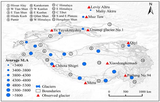 Spatial distribution of the average SLA in High Mountain Asia over the period of 2000–2021. The blue dots represent the average SLA of the glacier in the different regions.