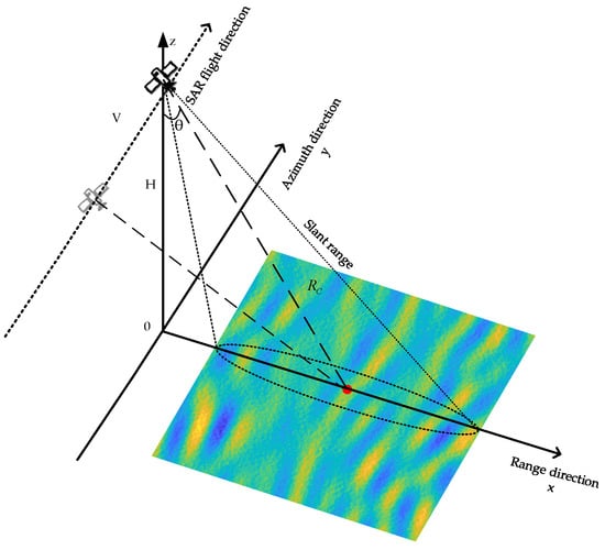The geometry of the SAR sea wave imaging system is shown in Figure 1. The SAR system transmits linear frequency modulation (LFM) signals to the sea surface and receives echo signals from the sea surface. In order to obtain the SAR image of the observed sea surface scene, the pulse compression technique of the received echo signal is required. The RD algorithm is used in this paper because it is the most widely used algorithm for the spaceborne high-resolution SAR image processing. The time-varying sea surface SAR echo signal can be expressed as follows according to []: