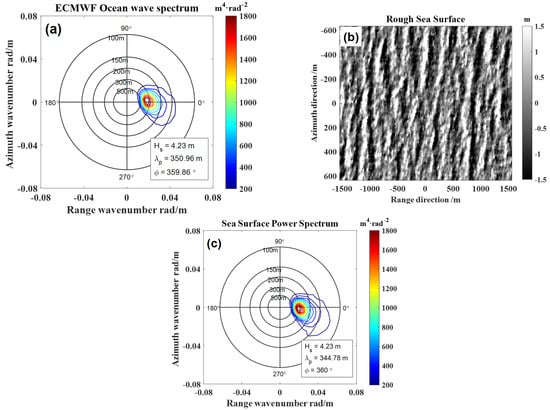The reanalysis ocean wave spectrum corresponding to SAR ID 1 and the reconstructed sea surface are shown in Figure 2a,b, respectively. To verify the reliability of the reconstructed sea surface, the spectrum of the reconstructed sea surface in Figure 2b is also shown in Figure 2c. From the comparison between Figure 2a,c, it is found that that the spectrum of the reconstructed sea surface is very consistent with the input spectrum, i.e., the reanalysis ocean wave spectrum. This result proves the reliability of the reconstruction method of the sea surface profile.