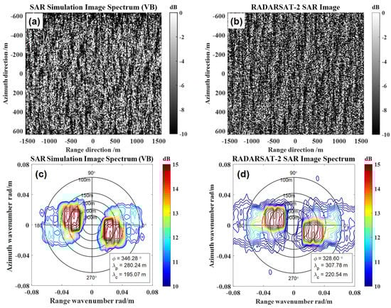 Based on the parameters of the sea environment in Table 1 and the parameters of the quad-polarization RADARSAT-2 SAR in Table 2, the simulated SAR image corresponding to SAR ID 1 with the center incidence angle 23.27° is compared with the actual SAR image in Figure 3. In Figure 3, the simulated SAR image is compared with the actual SAR image in three aspects: image patterns, image power spectrum, and statistical distribution function of SAR speckle noise. Firstly, the simulated HH-polarized SAR NRCS images are shown in Figure 3a,b, respectively. Comparing the patterns in Figure 3a with those in the actual SAR image (i.e., Figure 3b), we can find that the textural features in the actual image have been successfully simulated by the simulation method proposed in this paper. In order to further quantitatively compare the consistency of the texture features in the simulated SAR image with those in the actual SAR image, the power spectra of the simulated and the actual HH-polarized SAR NRCS images are also presented in Figure 3c,d, respectively. In order to show the spectra more clearly, we take the logarithm of the power spectra intensities in the following. One can find that the spectral density of the simulated SAR image is in good agreement with that of the actual image. Speckle noise is another intrinsic feature of SAR image. In Figure 3e, the statistical probability density distribution of the SAR image intensity based on the simulated SAR data is also compared with that obtained by the actual SAR image. Just as expected, the two probability density distribution curves in Figure 3e agree well with each other.