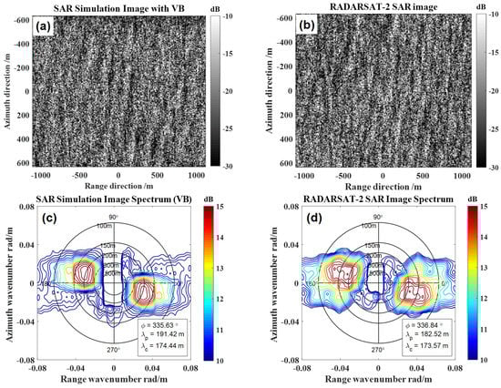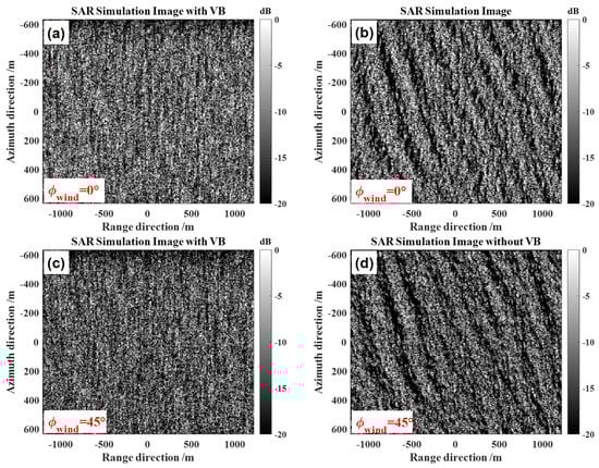 By comparing Figure 10 with Figure 12 and Figure 11 with Figure 13, the results show that the SAR imaging process of wind wave and swell indicates different texture features when the propagation direction is different. The influence of the VB effect is largest for ocean waves propagating along the azimuth direction. However, the VB effect does not necessarily vanish for ocean waves traveling along the range direction, depending on the ocean wavelength. Wind waves propagating along the range direction have strong azimuth displacement in the SAR images. However, the VB effect is not significant for the swells propagating along the range direction. For wind waves propagating along the azimuth direction, the VB effect has the most significant effect, leading to the disappearance of wave texture in the SAR image, but in the case of swell, the VB effect actually makes the wave texture clearer in SAR images. The comparison shows that the VB effect on SAR imaging is different when ocean wave wavelength is different. If the azimuth displacements are comparable with or greater than the ocean wavelength, the SAR images of ocean waves are nonlinearly distorted. Because the orbital acceleration and radial velocity within the resolution cell cause azimuthal resolution degradation, azimuthal stretching appears in the SAR images with the VB effect.